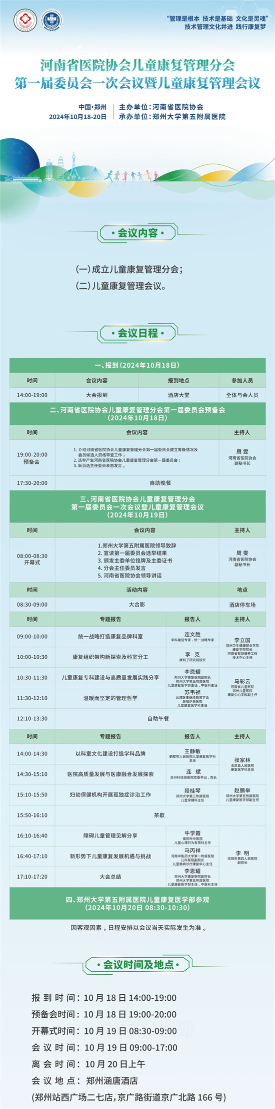 10月18日(周五)报到 ,10月18日(周五)下午河南省医院协会儿童康复管理分会第一届委员会预备会,10月19日(周六)会议,10月20日(周日)郑州大学第五附属医院儿童康复医学部参观。